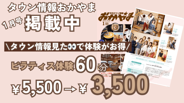 現在、タウン情報おかやま1月号(12/25発売・ピラティス特集 P81)掲載を記念して、「タウン情報を見た」とお伝えいただくと、60分ピラティス体験5,500円 → 3,500円※ 1月24日まで