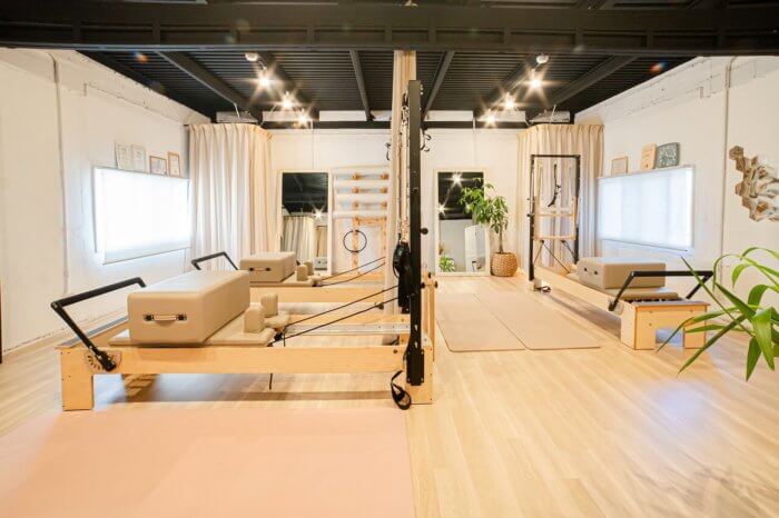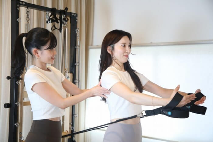 整体後、ストレッチポールやピラティス専用マシンを使い体を動かしていきます。ピラティスが初めての方でもお客様の運動経験や柔軟性に合わせながら行っていきます。